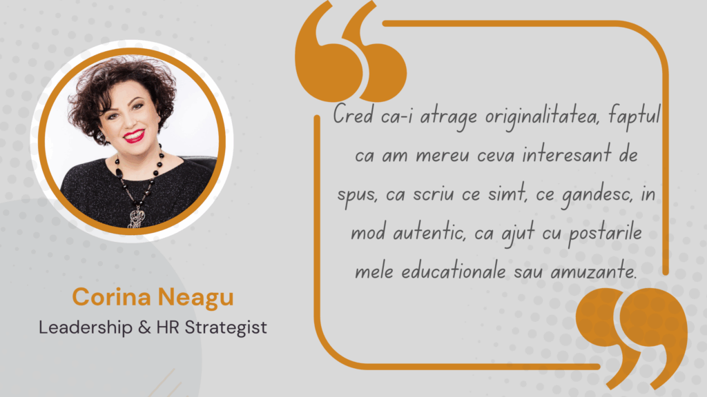 Corina Neagu, Leadership & HR Strategist, are peste 92000 de urmaritori (contacte) pe LinkedIn si fiecare postare zeci si sute de aprecieri, dar si comentarii sau redistribuiri ale acestora.