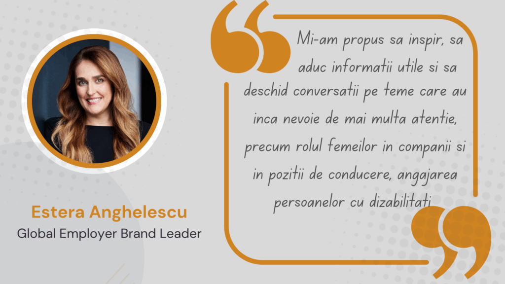 “Mi-am propus ca prin continutul pe care il creez sa inspir, sa aduc informatii utile si sa deschid conversatii pe teme care au inca nevoie de mai multa atentie, precum rolul femeilor in companii si in pozitii de conducere, angajarea persoanelor cu dizabilitati sau relevanta recrutarii intr-o perioada dominata de tehnologie si AI. Si m-am bucurat sa observ, de-a lungul timpului, ca multe persoane rezoneaza cu aceste teme si aleg sa ia parte la aceste discutii.”, spune ea.