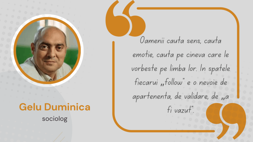 Comunitatile online se formeaza exact ca cele offline: pe incredere, pe valori comune si pe sentimentul ca „nu sunt singur”. “, spune sociologul Gelu Duminica.