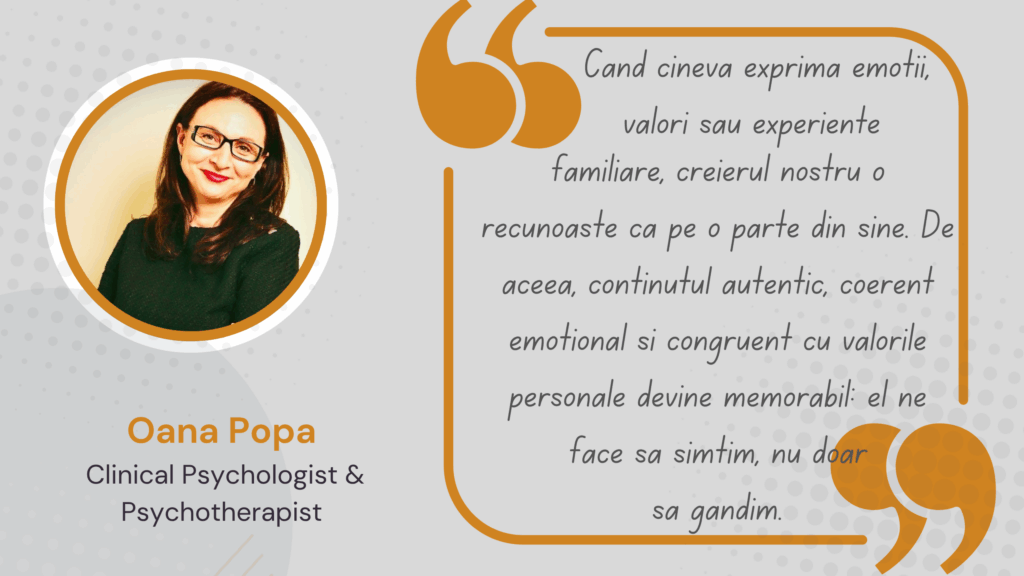 Cand cineva exprima emotii, valori sau experiente familiare, creierul nostru o recunoaste ca pe o parte din sine. De aceea, continutul autentic, coerent emotional si congruent cu valorile personale devine memorabil: el ne face sa simtim, nu doar sa gandim.”