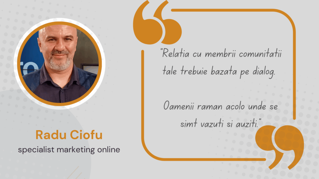 Despre crearea de comunitati online, Radu Ciofu – specialist marketing online, spune ca “totul incepe cu o intelegere clara a publicului tau: cine sunt oamenii carora te adresezi, ce ii motiveaza, ce provocari au si ce tip de continut ii face sa reactioneze. Cand stii asta, poti sa le livrezi continut relevant, care vorbeste direct despre nevoile si obiectivele lor.