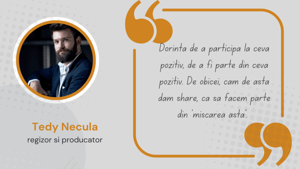 „E simplu”, spune Tedy, “gasesti in clipul ala ceva ce te influenteaza si iti trezeste dorinta de a participa la ceva pozitiv, de a fi parte din ceva pozitiv. Cel mai adesea esti surprins de emotia care iti sare in fata si te scoate din cotidian. De obicei, cam de asta dam share, ca sa facem parte din ‘miscarea asta’. Intervine oxitocina ca urmare a surprizei si a pozitivului si asta te face sa dai follow, share si sa fii curios.